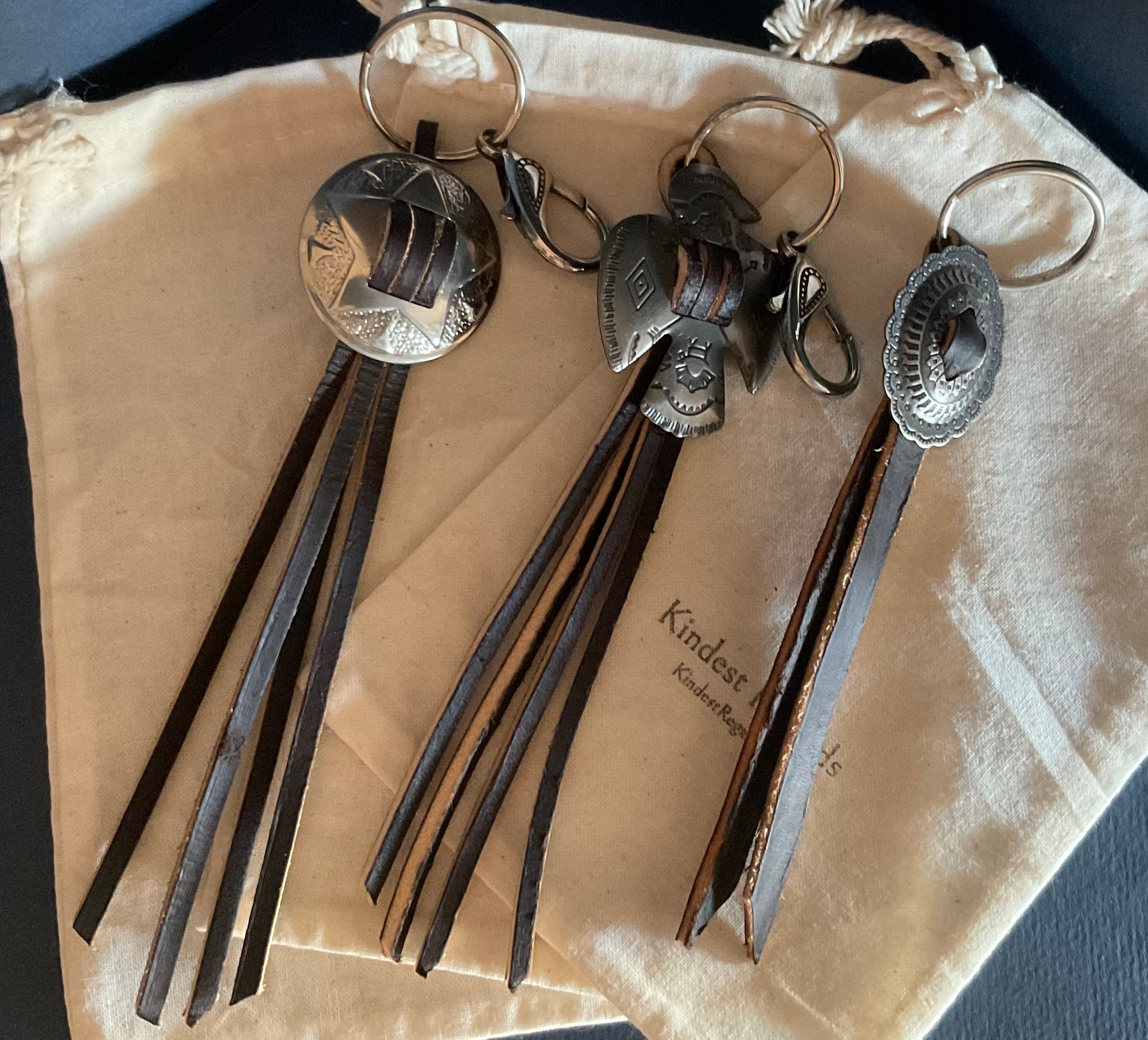 Featuring statement conchos and premium horse tack leather, these keychains are meant to get better with time. Lobster claw clasps provide versatility and easy accessibility.